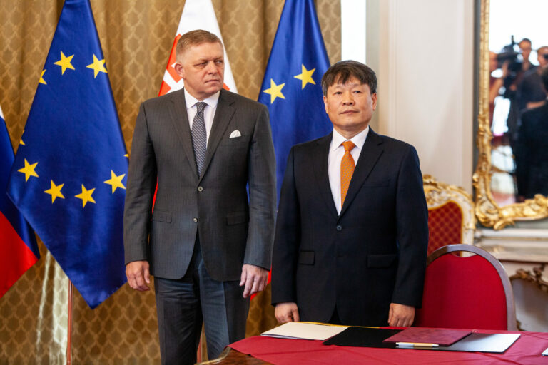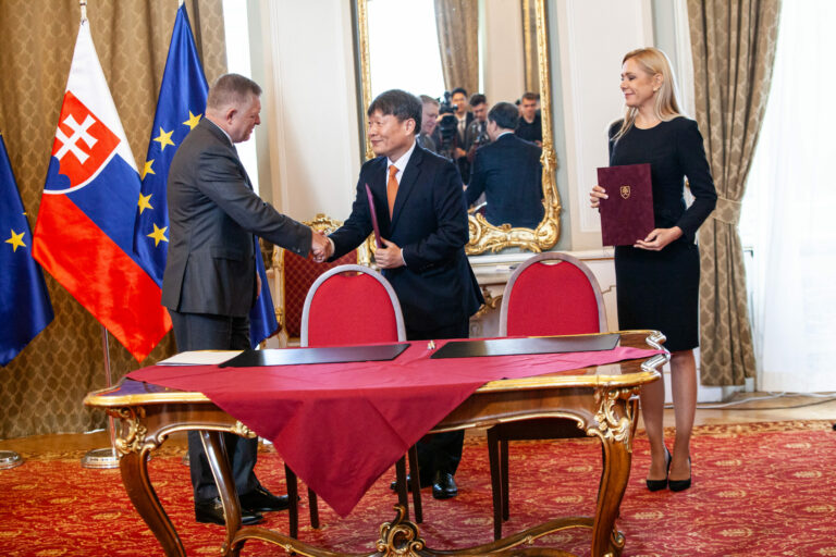 Zľava: Premiér Robert Fico a CEO a prezident Hyundai Mobis Lee Gyu Suk počas podpisu Memoranda o spolupráci medzi SR a spoločnosťou Hyundai Mobis v priestoroch Úradu vlády SR v Bratislave. Bratislava, 15. október 2024. Foto: SITA/Bokor Tomáš