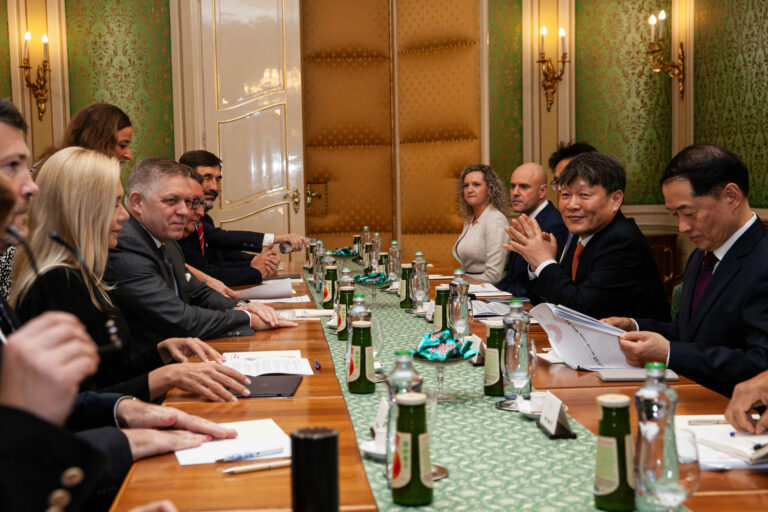 Zľava: Premiér Robert Fico (tretí zľava za stolom) a CEO a prezident Hyundai Mobis Lee Gyu Suk (druhý sprava) počas spoločného rokovania pred podpisom Memoranda o spolupráci medzi SR a spoločnosťou Hyundai Mobis v priestoroch Úradu vlády SR v Bratislave. Bratislava, 15. október 2024. Foto: SITA/Bokor Tomáš
