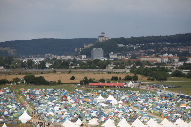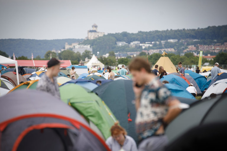Pohľad na stanové mestečko (v popredí) a Trenčiansky hrad (v pozadí) počas druhého dňa 25. ročníka multižánrového festivalu Pohoda 2022 na letisku v Trenčíne. Trenčín, 8. júl 2022. Foto: SITA/Branislav Bibel