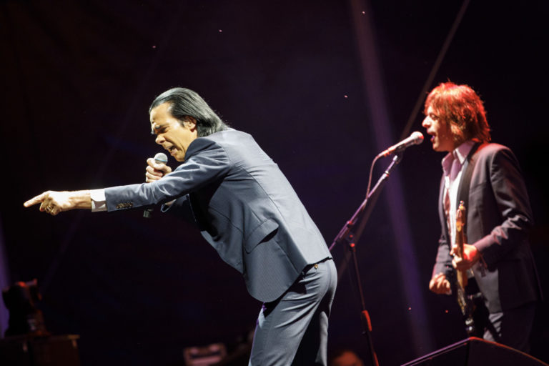 Spevák Nick Cave z austrálskej rockovej skupiny Nick Cave & The Bad Seeds (vpravo) počas vystúpenia na 25. ročníku multižánrového festivalu Pohoda 2022 na letisku v Trenčíne. Trenčín, 7. júl 2022. Foto: SITA/Branislav Bibel