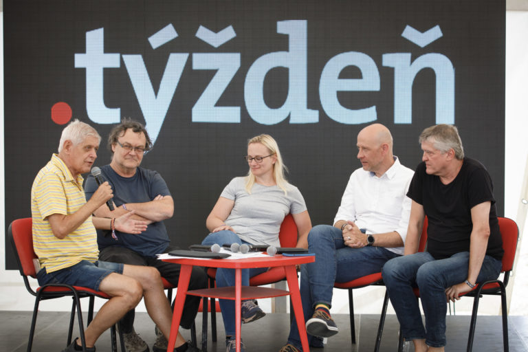 Zľava: Novinár Eugen Korda, spisovateľ Martin Mojžiš, novinárka Marína Gálisová, novinár Juraj Petrovič a novinár tefan Hríb počas diskusie v stane periodika .týždeň v rámci druhého dňa 25. ročníka multižánrového festivalu Pohoda 2022 na letisku v Trenčíne. Trenčín, 8. júl 2022. Foto: SITA/Branislav Bibel