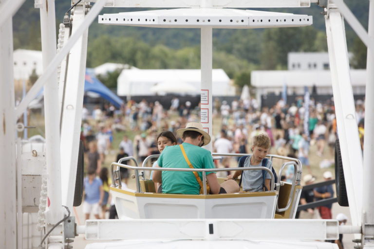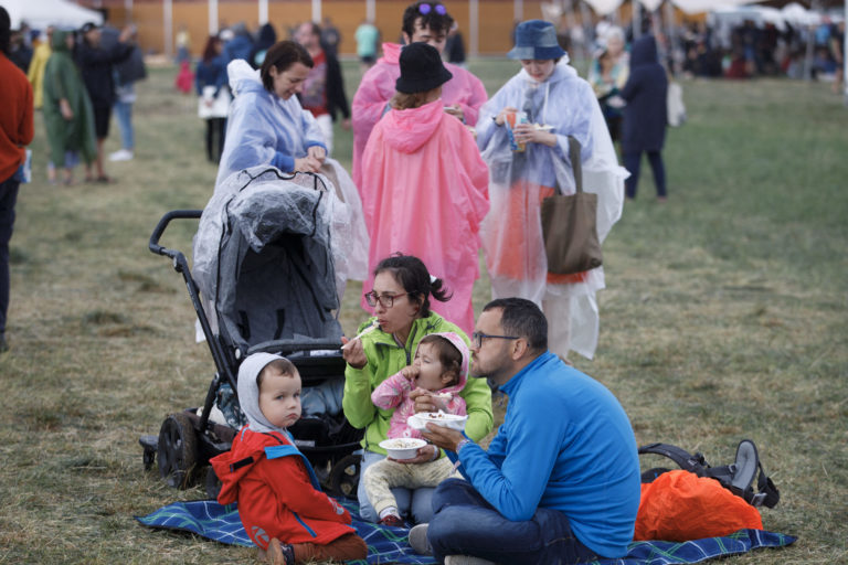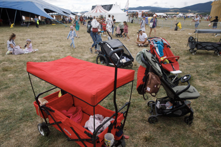 Rodičia s deťmi počas druhého dňa 25. ročníka multižánrového festivalu Pohoda 2022 na letisku v Trenčíne. Trenčín, 8. júl 2022. Foto: SITA/Branislav Bibel