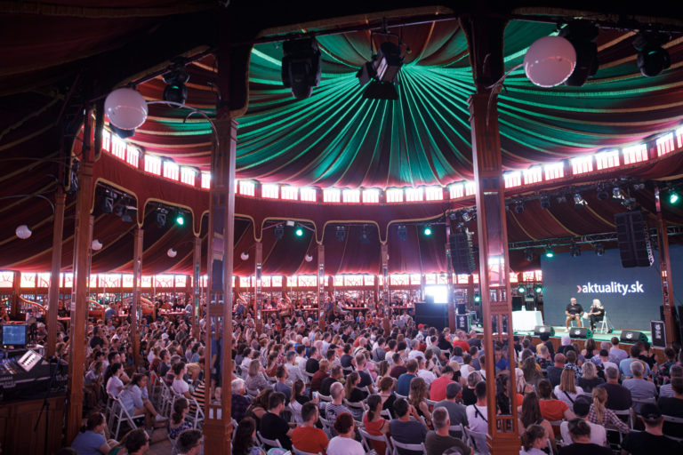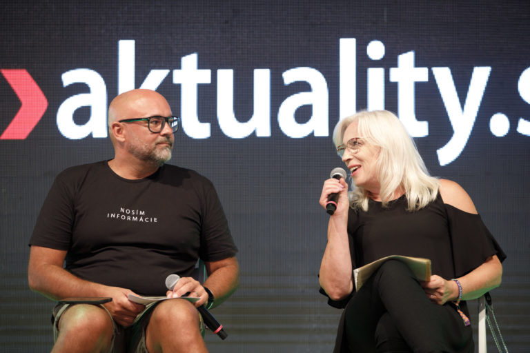 Sprava v pozadí: Profesorka sociológie, dekanka Fakulty masmédií Paneurópskej vysokej školy a bývalá premiérka SR Iveta Radičová a novinár Peter Bárdy počas diskusie v stane Aktuality.sk na tému: 30 rokov Slovenska v rámci druhého dňa 25. ročníka multižánrového festivalu Pohoda 2022 na letisku v Trenčíne. Trenčín, 8. júl 2022. Foto: SITA/Branislav Bibel