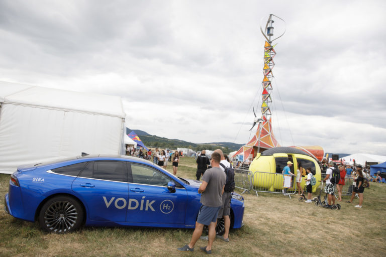 Návštevníci pri vodíkovom aute počas druhého dňa 25. ročníka multižánrového festivalu Pohoda 2022 na letisku v Trenčíne. Trenčín, 8. júl 2022. Foto: SITA/Branislav Bibel