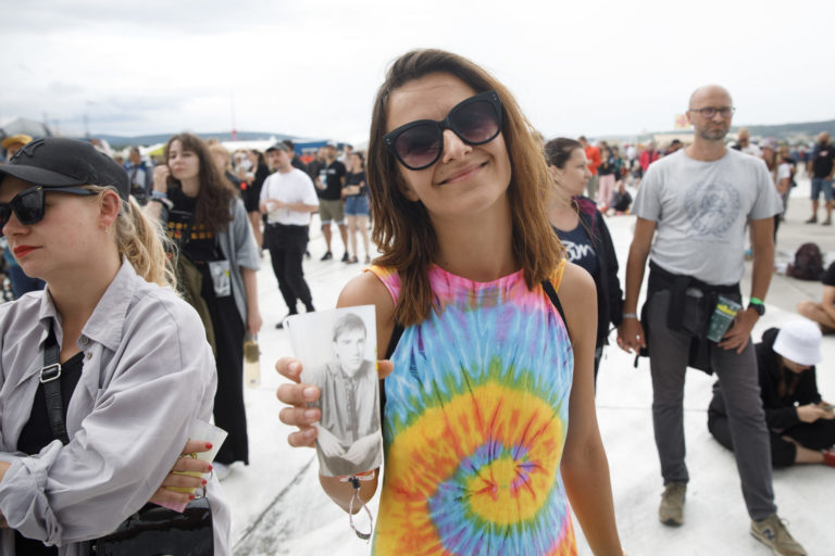 Návštevníčka drží pohár s podobizňou Miroslava alias Mekyho birku počas druhého dňa 25. ročníka multižánrového festivalu Pohoda 2022 na letisku v Trenčíne. Trenčín, 8. júl 2022. Foto: SITA/Branislav Bibel