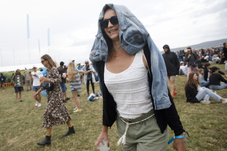 Návštevníčka sa cháni pred dažďom počas druhého dňa 25. ročníka multižánrového festivalu Pohoda 2022 na letisku v Trenčíne. Trenčín, 8. júl 2022. Foto: SITA/Branislav Bibel