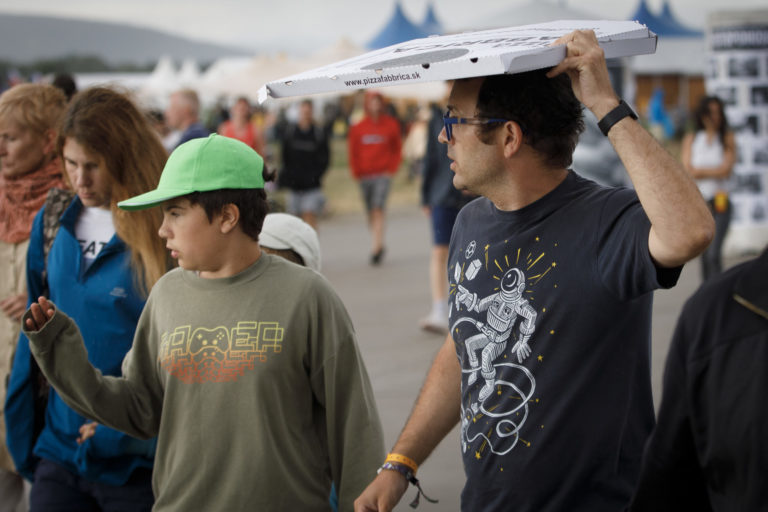 Návštevník sa chráni pizza krabicou pred dažďom počas druhého dňa 25. ročníka multižánrového festivalu Pohoda 2022 na letisku v Trenčíne. Trenčín, 8. júl 2022. Foto: SITA/Branislav Bibel