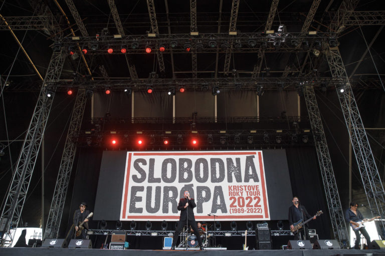 Zľava: Gitarista Svetozár Korbeľ alias Sveťo, spevák Miloslav Láber alias Whisky, basgitarista Rasťo Gore a gitarista Laco Lučenič počas koncertu slovenskej punk-rockovej kapely Slobodná Európa na 25. ročníku multižánrového festivalu Pohoda 2022 na letisku v Trenčíne. Trenčín, 8. júl 2022. Foto: SITA/Branislav Bibel