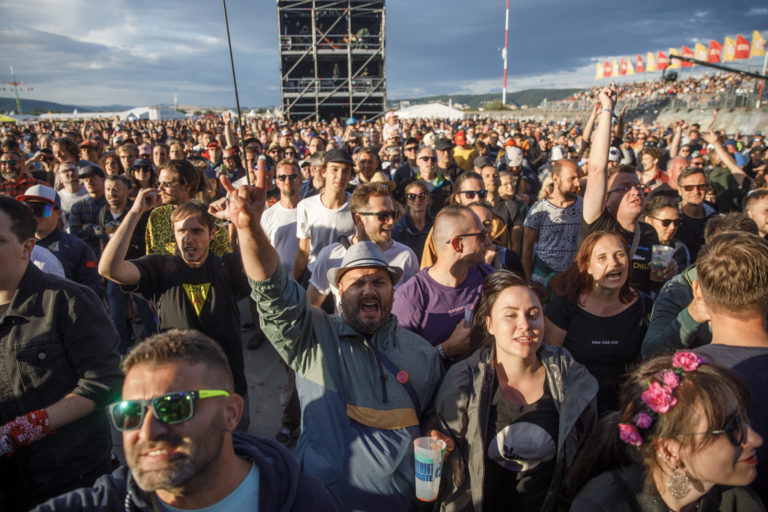 Fanúšikovia počas koncertu slovenskej punk-rockovej kapely Slobodná Európa na 25. ročníku multižánrového festivalu Pohoda 2022 na letisku v Trenčíne. Trenčín, 8. júl 2022. Foto: SITA/Branislav Bibel
