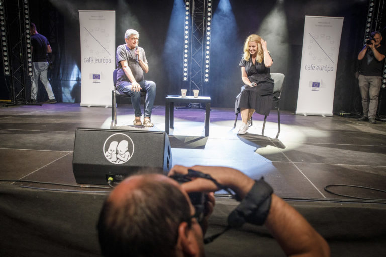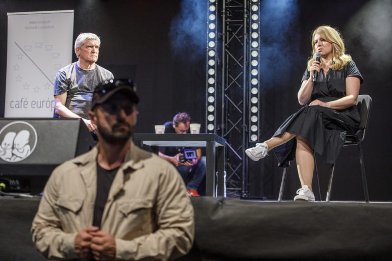 Zľava: Novinár tefan Hríb a prezidentka SR Zuzana Čaputová počas diskusie v EUrópa stage na tému: Tri roky s prezidentkou SR v rámci tretieho dňa 25. ročníka multižánrového festivalu Pohoda 2022 na letisku v Trenčíne. Trenčín, 9. júl 2022. Foto: SITA/Branislav Bibel Foto: SITA/Branislav Bibel
