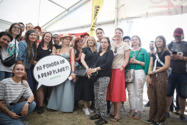 Uprostred zľava: Prezidentka SR Zuzana Čaputová a jej partner Juraj Rizman pózujú na skupinovej fotografií pri stánku Greenpeace v NGO stane počas 25. ročníka multižánrového festivalu Pohoda 2022 na letisku v Trenčíne. Trenčín, 9. júl 2022. Foto: SITA/Branislav Bibel