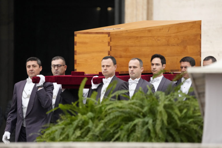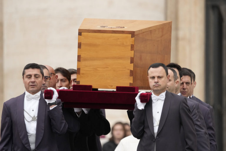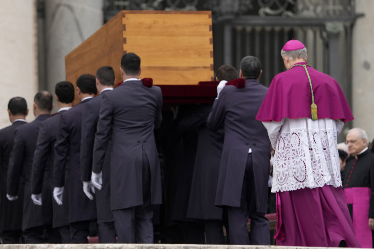 Rakvu zosnulého emeritného pápeža Benedikta XVI. nesú do Baziliky sv. Petra vo Vatikáne. Foto: SITA/AP