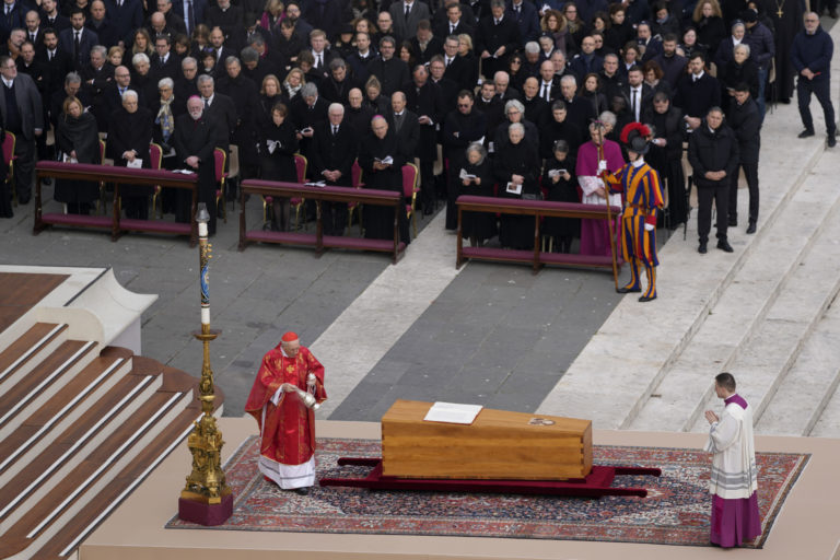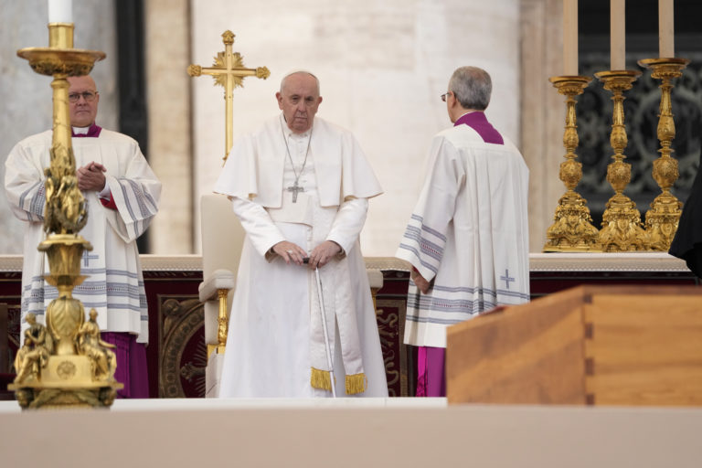 Pápež František (uprostred) sedí za rakvou zosnulého emeritného pápeža Benedikta XVI. na Námestí svätého Petra počas zádušnej omše vo Vatikáne, štvrtok 5. januára 2023. Foto: SITA/AP