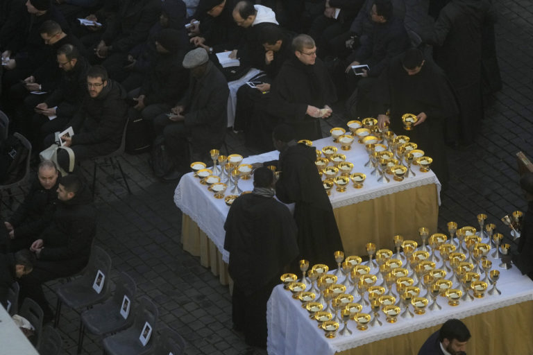 Nádoby na sväté prijímanie sú pripravené pred zádušnou omšou za zosnulého emeritného pápeža Benedikta XVI. na Námestí sv. Petra vo Vatikáne, štvrtok 5. januára 2023. Foto: SITA/AP