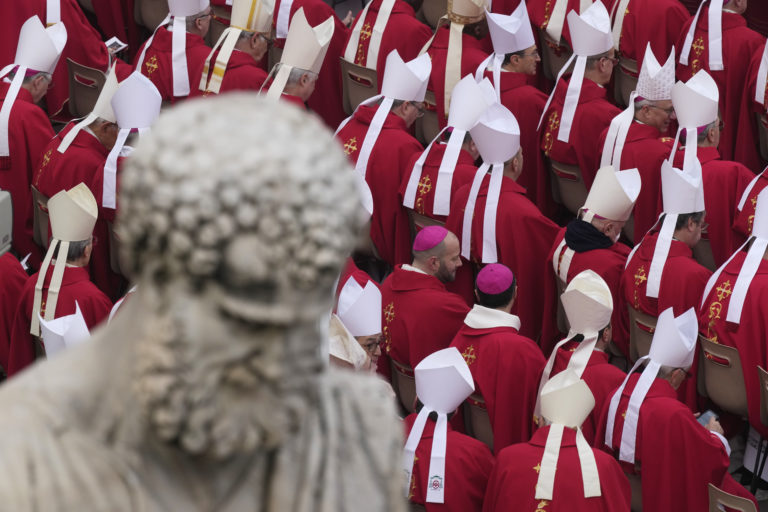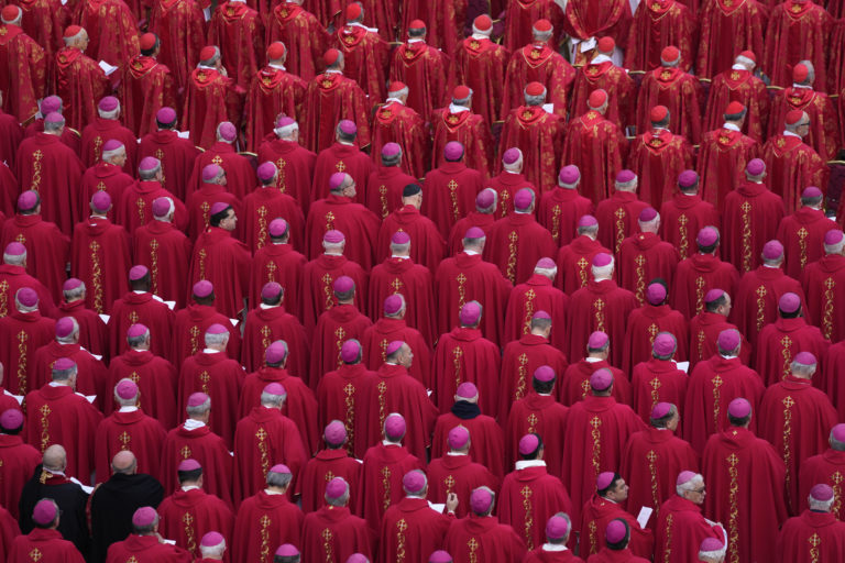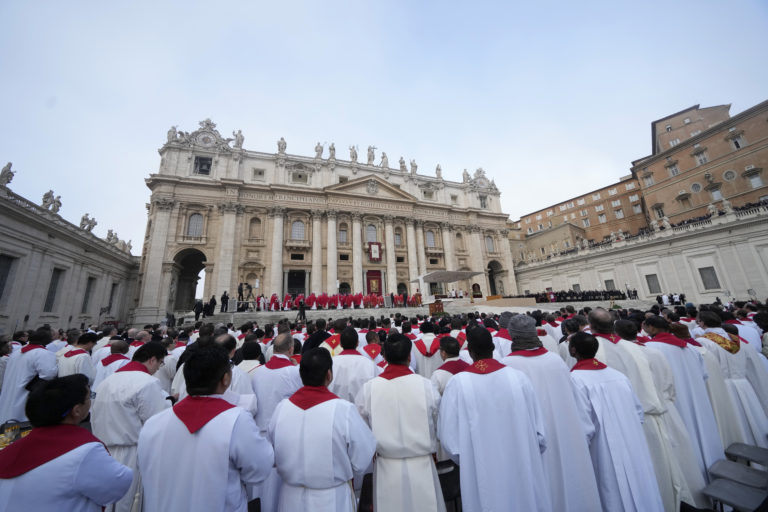 Kňazi na Námestí svätého Petra vo Vatikáne počas zádušnej omše za zosnulého emeritného pápeža Benedikta XVI. vo štvrtok 5. januára 2023. Foto: SITA/AP