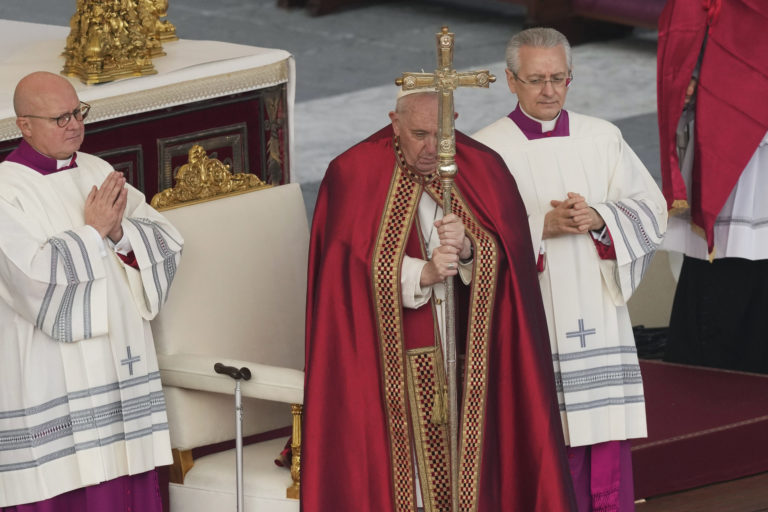 Pápež František (uprosted) slávi zádušnú omšu za zosnulého emeritného pápeža Benedikta XVI. na Námestí sv. Petra vo Vatikáne, štvrtok 5. januára 2023. Foto: SITA/AP