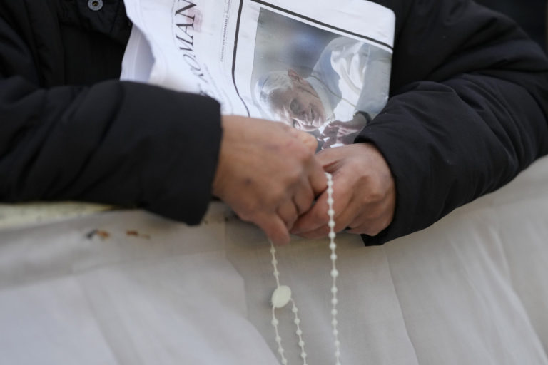 Rehoľná sestra drží ruženec a noviny s obrázkom zosnulého emeritného pápeža Benedikta XVI., kým čaká na začiatok jeho zádušnej omše na Námestí svätého Petra vo Vatikáne vo štvrtok 5. januára 2023. Foto: SITA/AP