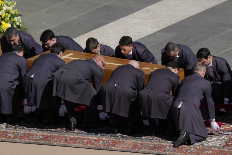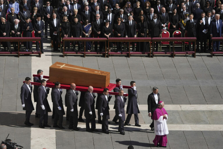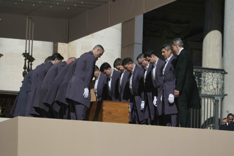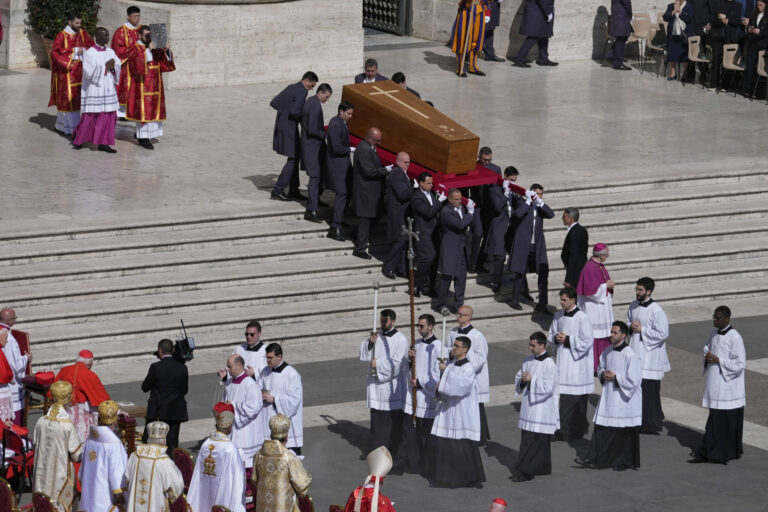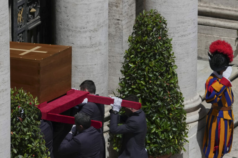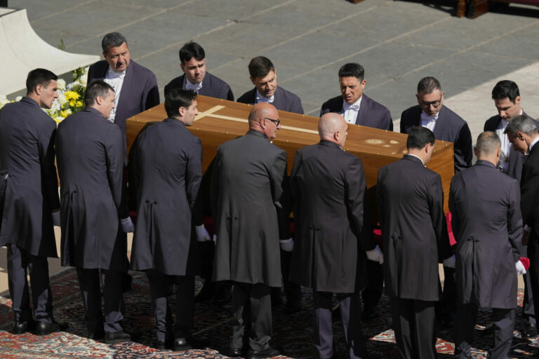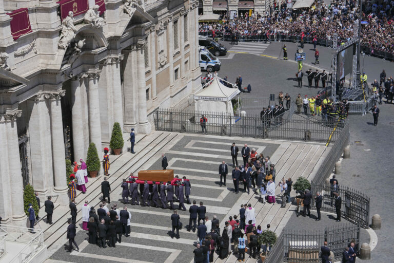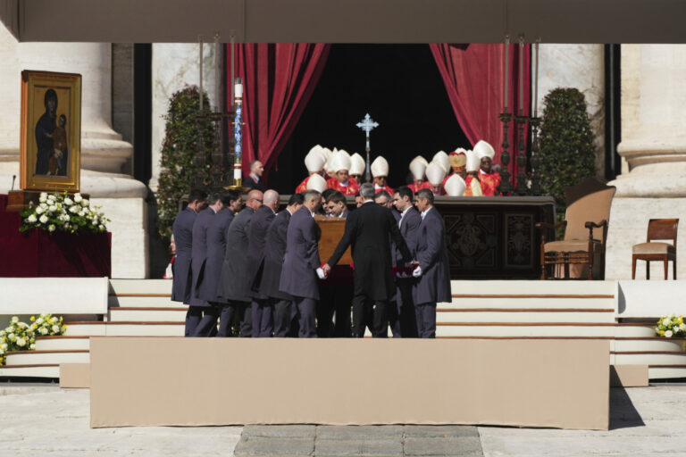 Rakvu s telom pápeža Františka po pohrebnom obrade na Námestí sv. Petra vnášajú späť do Baziliky sv. Petra odkiaľ ju potom previezli do do Baziliky Santa Maria Maggiore. Vatikán, 26. apríl 2025. Foto: SITA/AP.