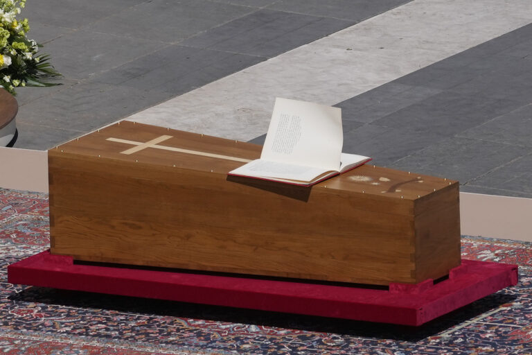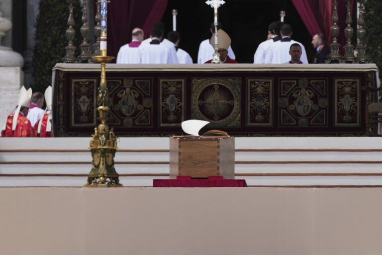 Rakva s telom pápeža Františka na Námestí sv. Petra počas poslednej rozlúčky. Vatikán, 26. apríl 2025. Foto: SITA/AP.