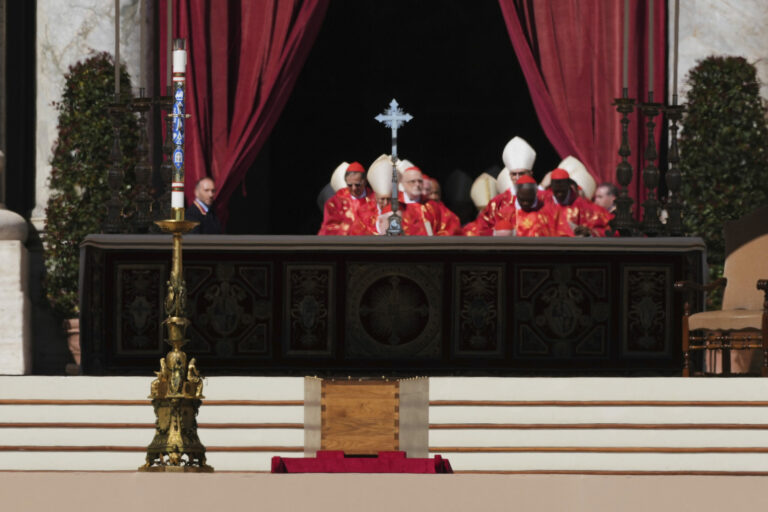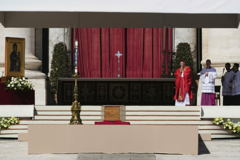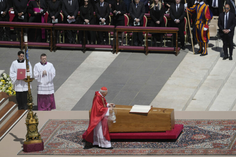 Pobrebné obrady za zosnulého pápeža Františka vedie kardinál Giovanni Battista Re. Vatikán, 26. apríl 2025. Foto: SITA/AP.