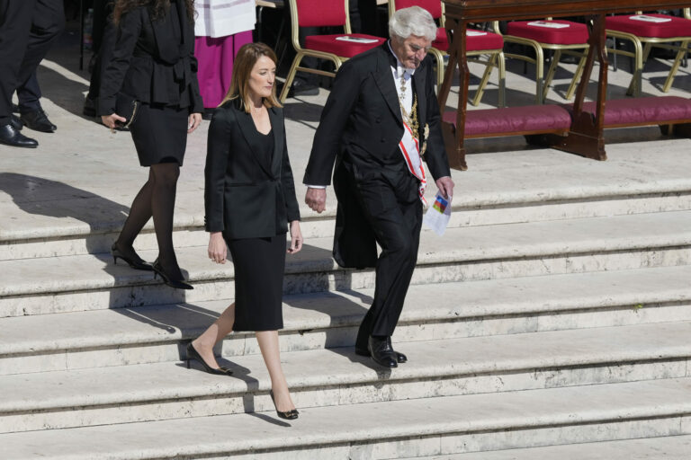 Predsedníčka Európskeho parlamentu Roberta Metsola na poslednej rozlúčke s pápežom Františkom. Vatikán, 26. apríl 2025. Foto: SITA/AP.