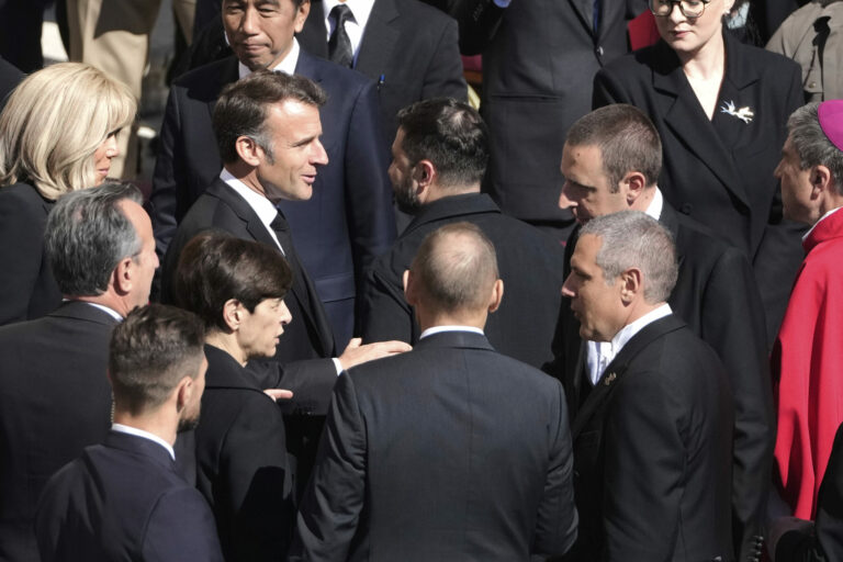 Francúzsky prezident Emmanuel Macron na poslednej rozlúčke s pápežom Františkom. Vatikán, 26. apríl 2025. Foto: SITA/AP.