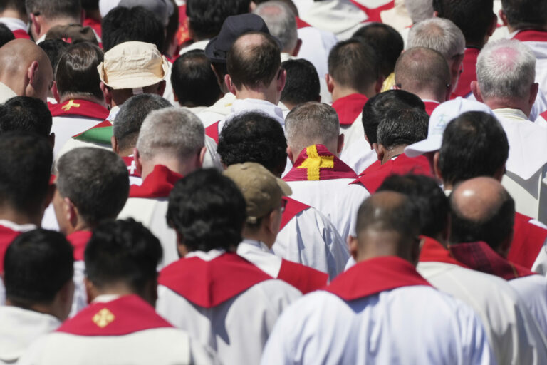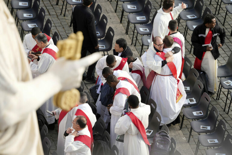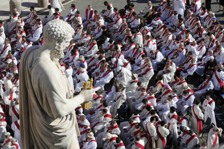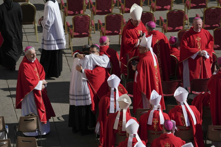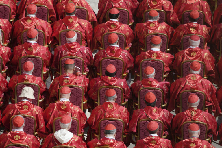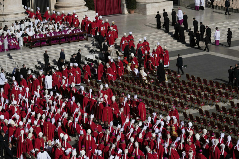 Kardináli si sadajú na svoje miesta na poslednej rozlúčke s pápežom Františkom na Námestí svätého Petra vo Vatikáne. Vatikán, 26. apríl 2025. Foto: SITA/AP.