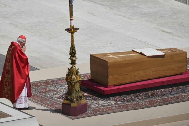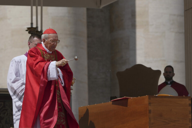 Kardinál Giovanni Battista Re počas poslednej rozlúčka s pápežom Františkom. Vatikán, 26. apríl 2025. Foto: SITA/AP.