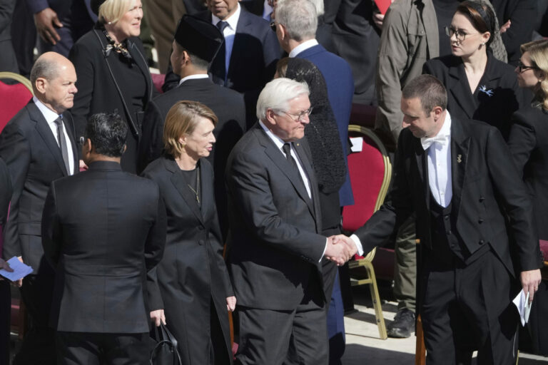Germany's President Frank Walter Steinmeier, second right, and German Chancellor Olaf Scholz, left, arrive for the funeral of Pope Francis in St. Peter's Square at the Vatican, Saturday, April 26, 2025. (AP Photo/Markus Schreiber) Foto: SITA/AP.