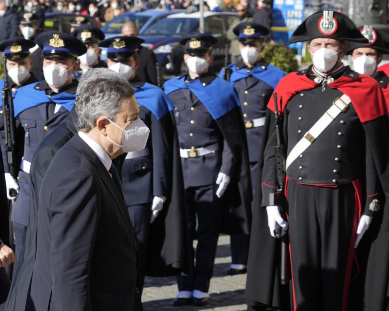 Italian Premier Mario Draghi arrives for the state funerals of late EU Parliament President David Sassoli at Santa Maria degli Angeli Basilica in Rome, Friday, Jan. 14, 2022. David Sassoli, an Italian journalist who worked his way up in politics while defending the downtrodden and oppressed to become president of the European Union's parliament, died in an Italian hospital on Tuesday at 65. (AP Photo/Gregorio Borgia) Foto: SITA/AP