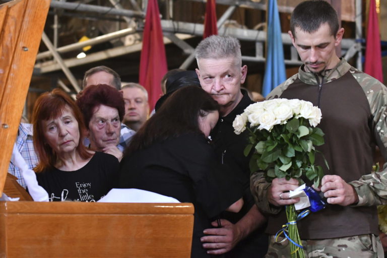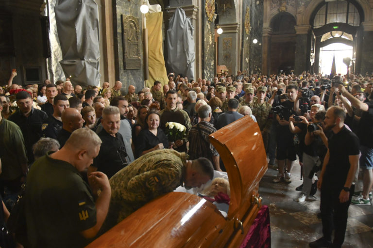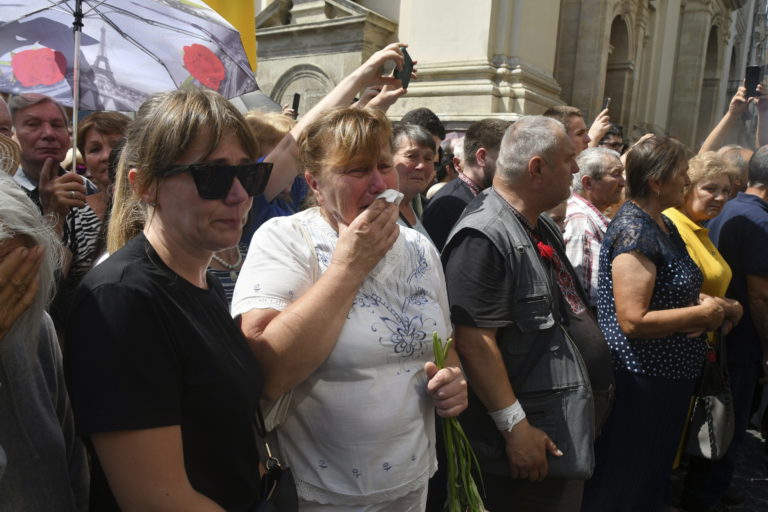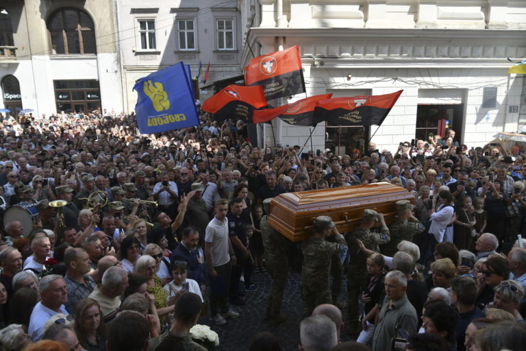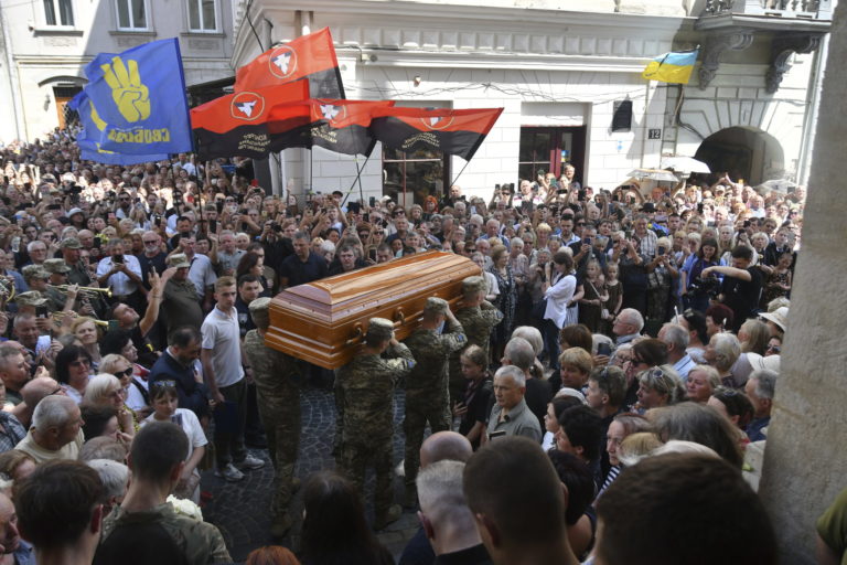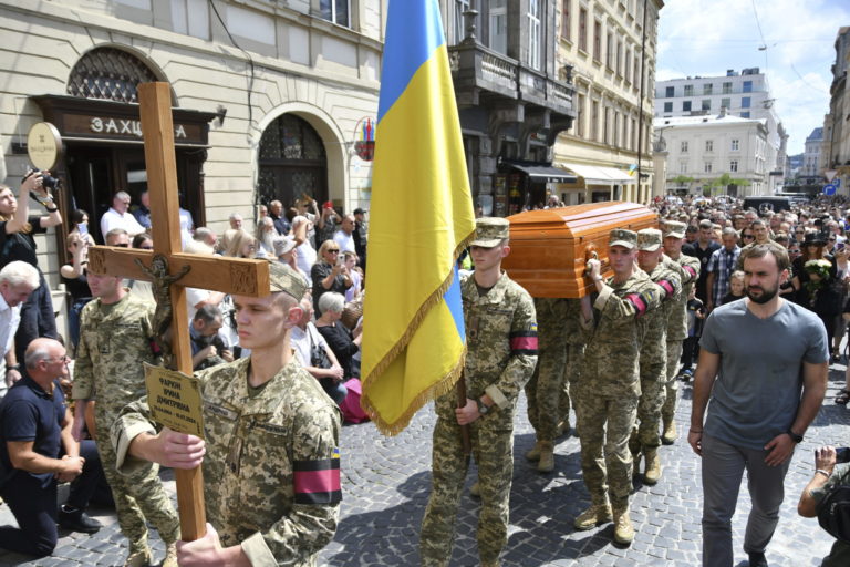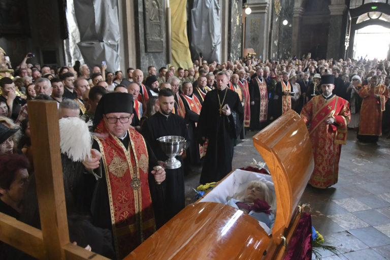 Na pohrebe zavraždenej bývalej nacionalistickej poslankyne Iryny Farionovej sa zúčastnili tisíce ľudí. Foto: SITA/AP