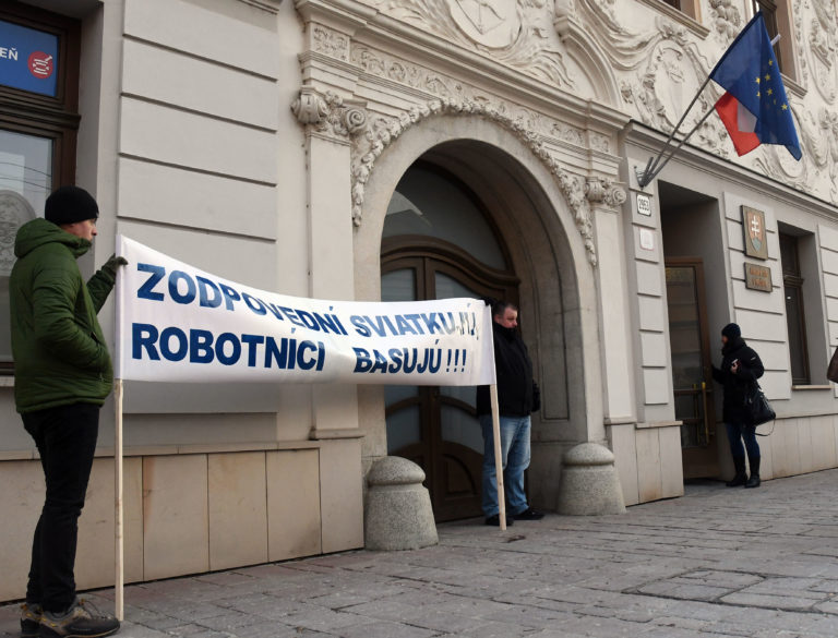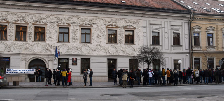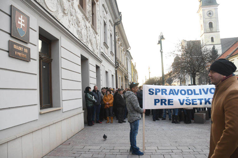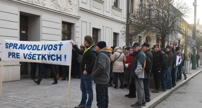 Obyvatelia Gelnice a Kojšova protestujú pred Krajským súdom v Prešove počas neverejného pojednávania o procesných úkonoch vo veci odvolania sa trojice mužov v súvislosti s výbuchom plynu v bytovke na Mukačevskej ulici v Prešove. Prešov, 30. december 2019. Foto: SITA/Viktor Zamborský