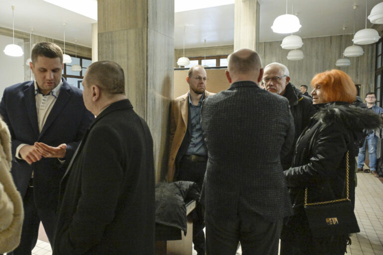 Advokát Adam P. (vľavo) obžalovaný z vraždy Daniela Tupého a otec Daniela Tupého Daniel Tupý starší (druhý sprava) pred hlavným pojednávaníním v kauze vraždy študenta Daniela Tupého na Mestskom súde v Bratislave. Bratislava, 5. február 2025. Foto: SITA/Milan Illík