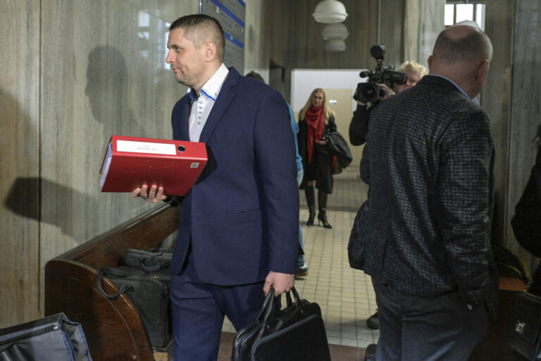Advokát Adam P. (druhý sprava) obžalovaný z vraždy Daniela Tupého počas hlavného pojednávania v kauze vraždy študenta Daniela Tupého na Mestskom súde v Bratislave. Bratislava, 5. február 2025. Foto: SITA/Milan Illík