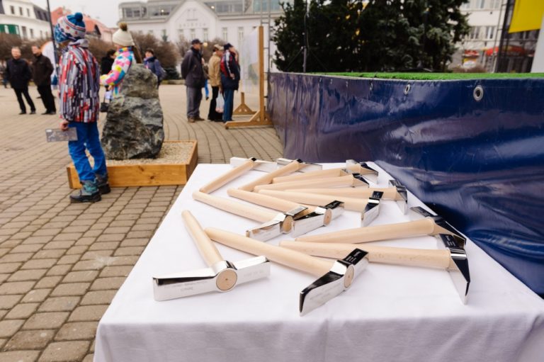 Kladivká pre poklopanie základného kameňa stavby diaľničného úseku D1 Hričovské Podhradie – Lietavská Lúčka. Žilina, 20. február 2014. Foto: SITA/Milo Fabian