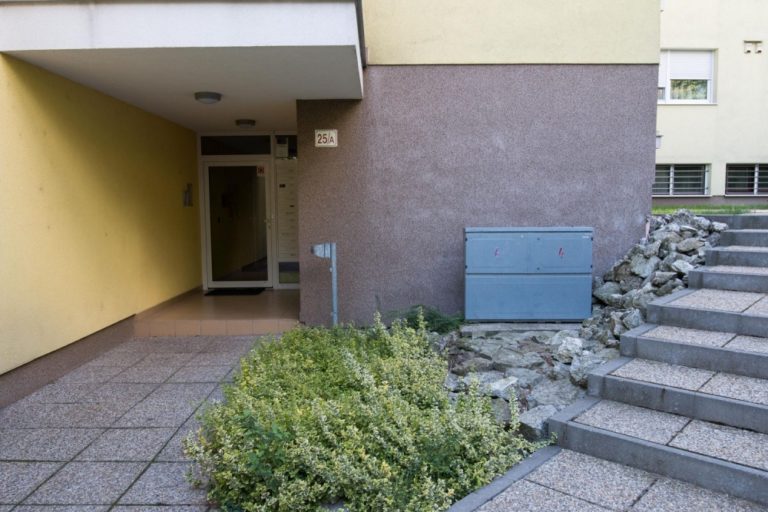 Pohľad na vchod bytového komplexu na Tupého ulici, kde prebiehala policajná razia v prípade Bašternák. Podnikateľ Ladislav Bašternák je podozrivý z nadmerných odpočtov DPH. Bratislava, 29. jún 2016. Foto: SITA/Marek Mrviš