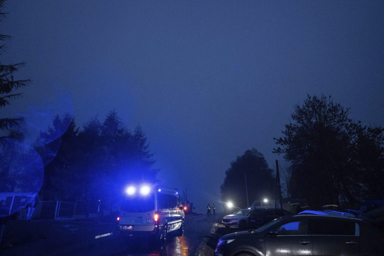 Policajné vozidlo smeruje k miestu výbuchu v poľskom Przewodówe, v stredu 16. novembra 2022. Foto: SITA/AP