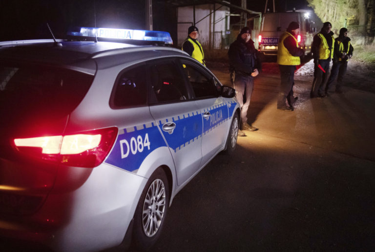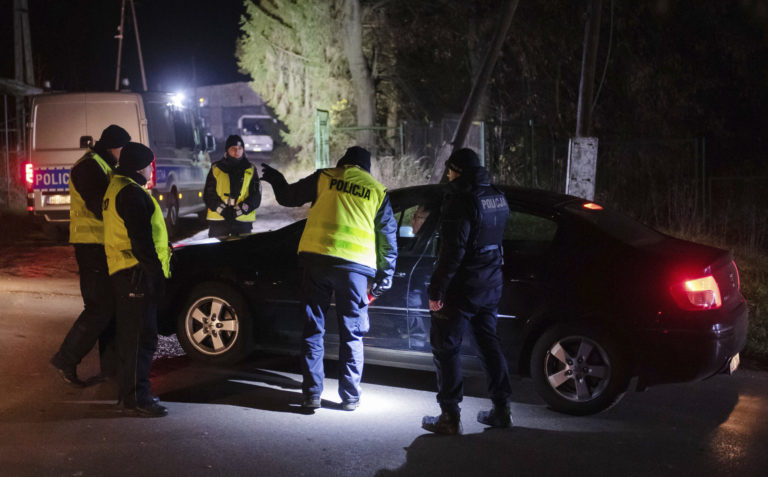 Policajti kontrolujú doklady šoférov na kontrolnom stanovišti neďaleko miesta výbuchu v poľskom Przewodówe. Foto: SITA/AP