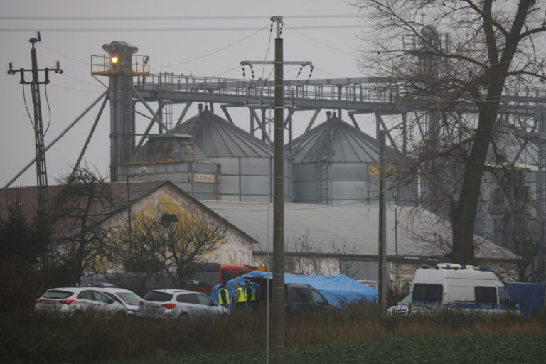 Policajti pred skladom obilia v Przewodówe, kde výbuch rakety zabil dvoch ľudí (16. november 2022). Foto: SITA/AP
