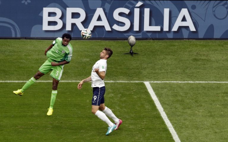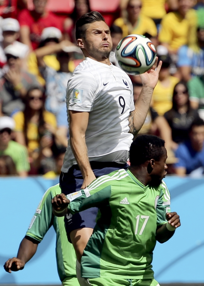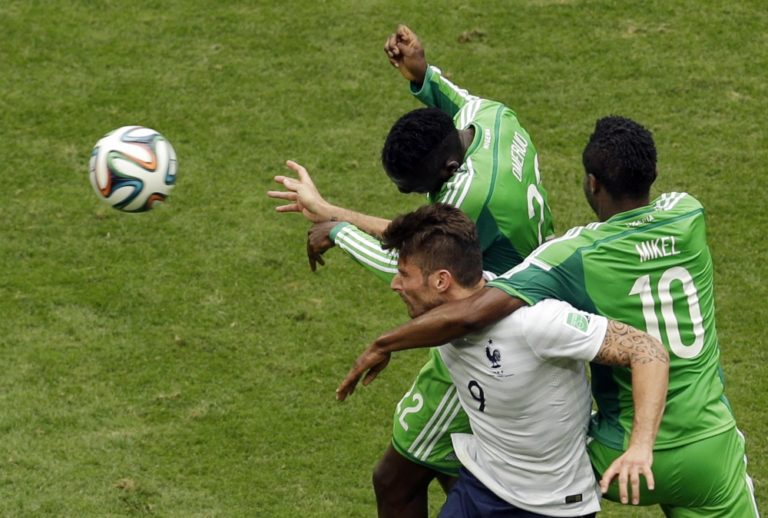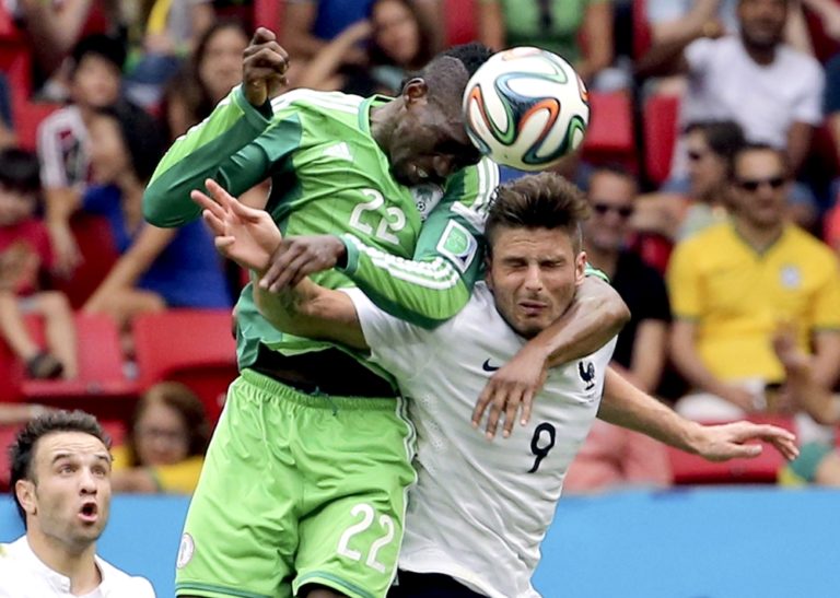 Francúz Olivier Giroud (9) v súboji s nigérijským futbalistom Ogenyiom Onazim (17) počas pondelňajšieho osemfinálového zápasu na svetovom šampionáte v Brazílii. Foto: SITA/AP