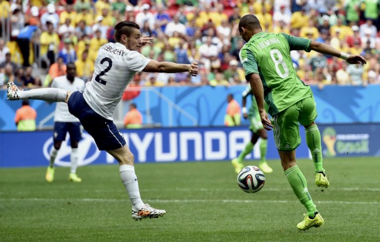 Francúz Mathieu Valbuena v súboji s nigérijským futbalistom Ahmedom Musom počas pondelňajšieho osemfinálového zápasu na svetovom šampionáte v Brazílii. Foto: SITA/AP