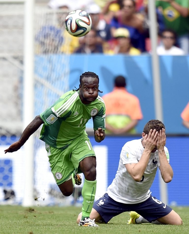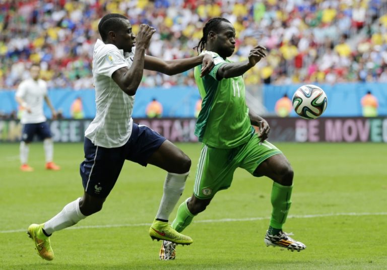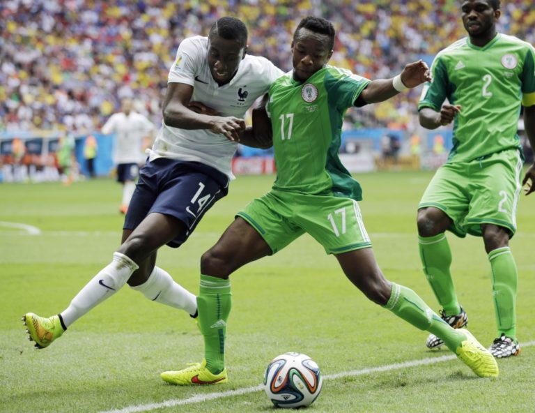 Francúz Blaise Matuidi v súboji s nigérijským futbalistom Victorom Mosesom (11) počas pondelňajšieho osemfinálového zápasu na svetovom šampionáte v Brazílii. Foto: SITA/AP