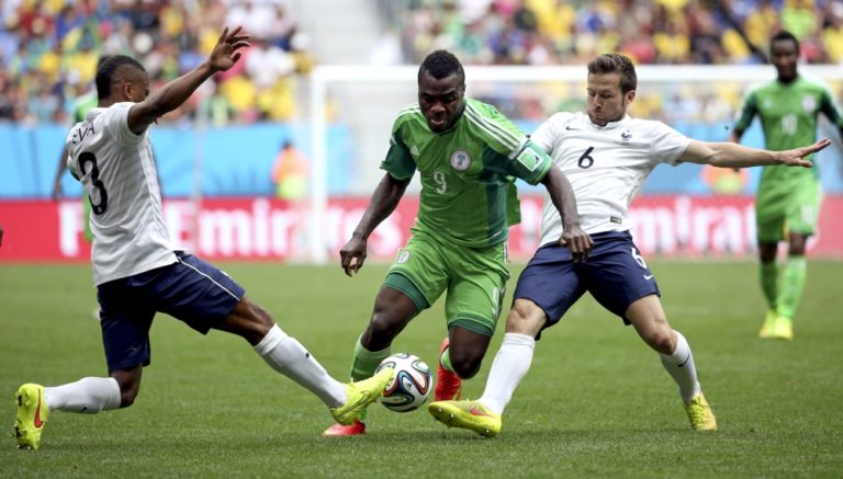 Nigérijský futbalista Emmanuel Emenike (9) v súboji s Francúzmi počas pondelňajšieho osemfinálového zápasu na svetovom šampionáte v Brazílii. Foto: SITA/AP