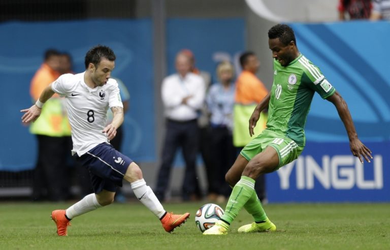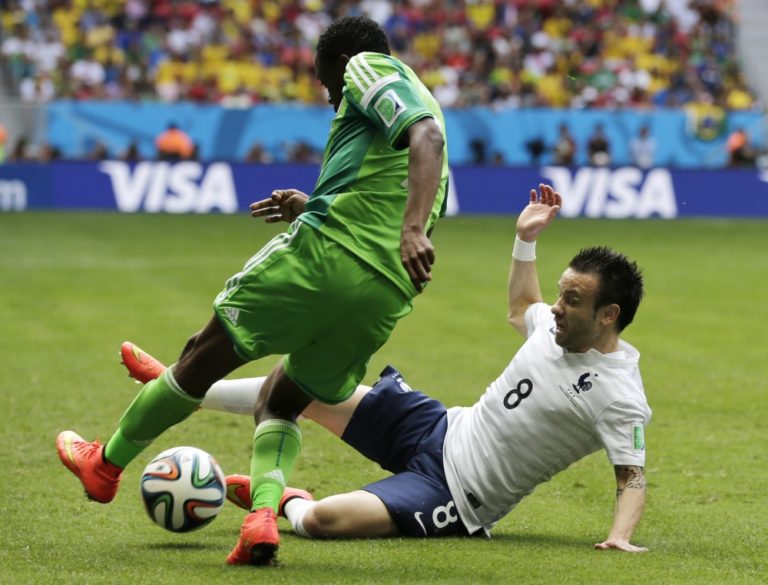 Francúz Mathieu Valbuena v súboji s nigérijským futbalistom Johnom Obi Mikelom počas pondelňajšieho osemfinálového zápasu na svetovom šampionáte v Brazílii. Foto: SITA/AP
