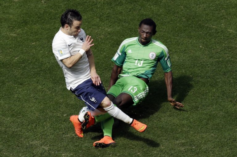 Francúz Mathieu Valbuena v súboji s nigérijským futbalistom Juwonom Oshaniwom počas pondelňajšieho zápasu na svetovom šampionáte v Brazílii. Foto: SITA/AP