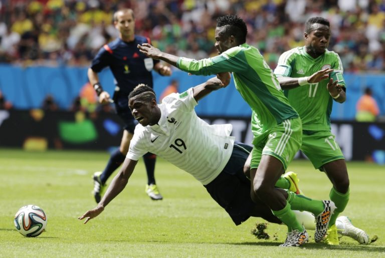 Francúz Paul Pogba v súboji s nigérijskými futbalistami Kennethom Omeruom a Ogenyiom Onazim (17) počas pondelňajšieho osemfinálového zápasu na svetovom šampionáte v Brazílii. Foto: SITA/AP
