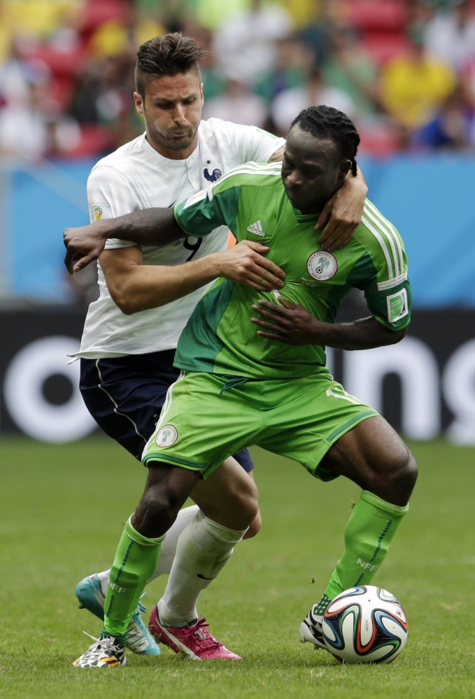 Francúz Olivier Giroud (9) v súboji s nigérijským futbalistom Victorom Mosesom počas pondelňajšieho osemfinálového zápasu na svetovom šampionáte v Brazílii. Foto: SITA/AP