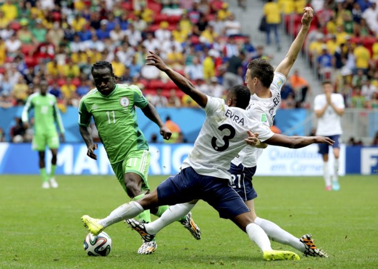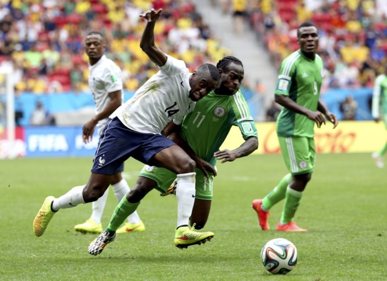 Francúz Blaise Matuidi v súboji s nigérijským futbalistom Victorom Mosesom počas pondelňajšieho osemfinálového zápasu na svetovom šampionáte v Brazílii. Foto: SITA/AP