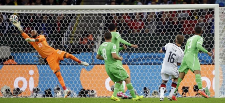 Zákrok alžírskeho brankára Raisa M’Bolhia po strele nemeckého futbalistu Philippa Lahma počas pondelňajšieho osemfinálového zápasu na svetovom šampionáte v Brazílii. Foto: SITA/AP
