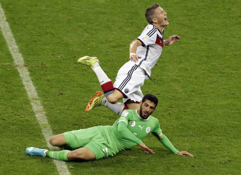 Alžírčan Rafik Halliche v súboji s nemeckým futbalistom Bastianom Schweinsteigerom počas pondelňajšieho osemfinálového zápasu na svetovom šampionáte v Brazílii. Foto: SITA/AP